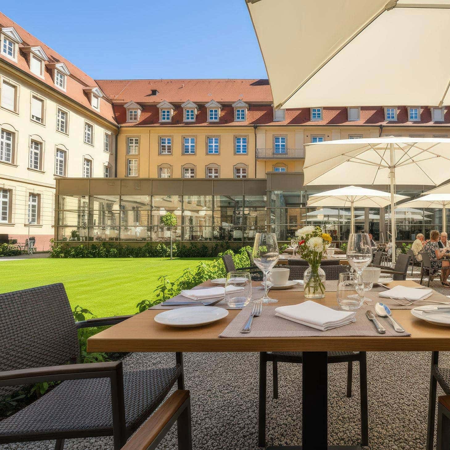 Im modernen Glaspavilion im historischen Innenhof erwartet Sie das Restaurant Abbatia – sieben Tage die Woche geöffnet, von Frühstück über Mittagessen bis zum Abendessen.